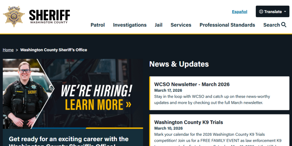 The Washington County Sheriff’s Office manages inmate records and daily jail operations within the county detention system. It also carries out public safety duties tied to arrests, booking, and custody tracking.